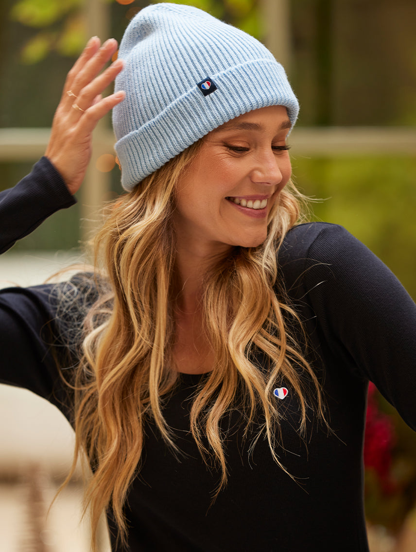 Notre Bonnet Bleu Ciel : Tout doux, une forme parfaite, chaud mais respirant. Il sera votre meilleur ami tout l’hiver ! Vous pouvez aussi choisir parmi les 3 autres couleurs disponibles : bleu marine, crème et bordeaux.