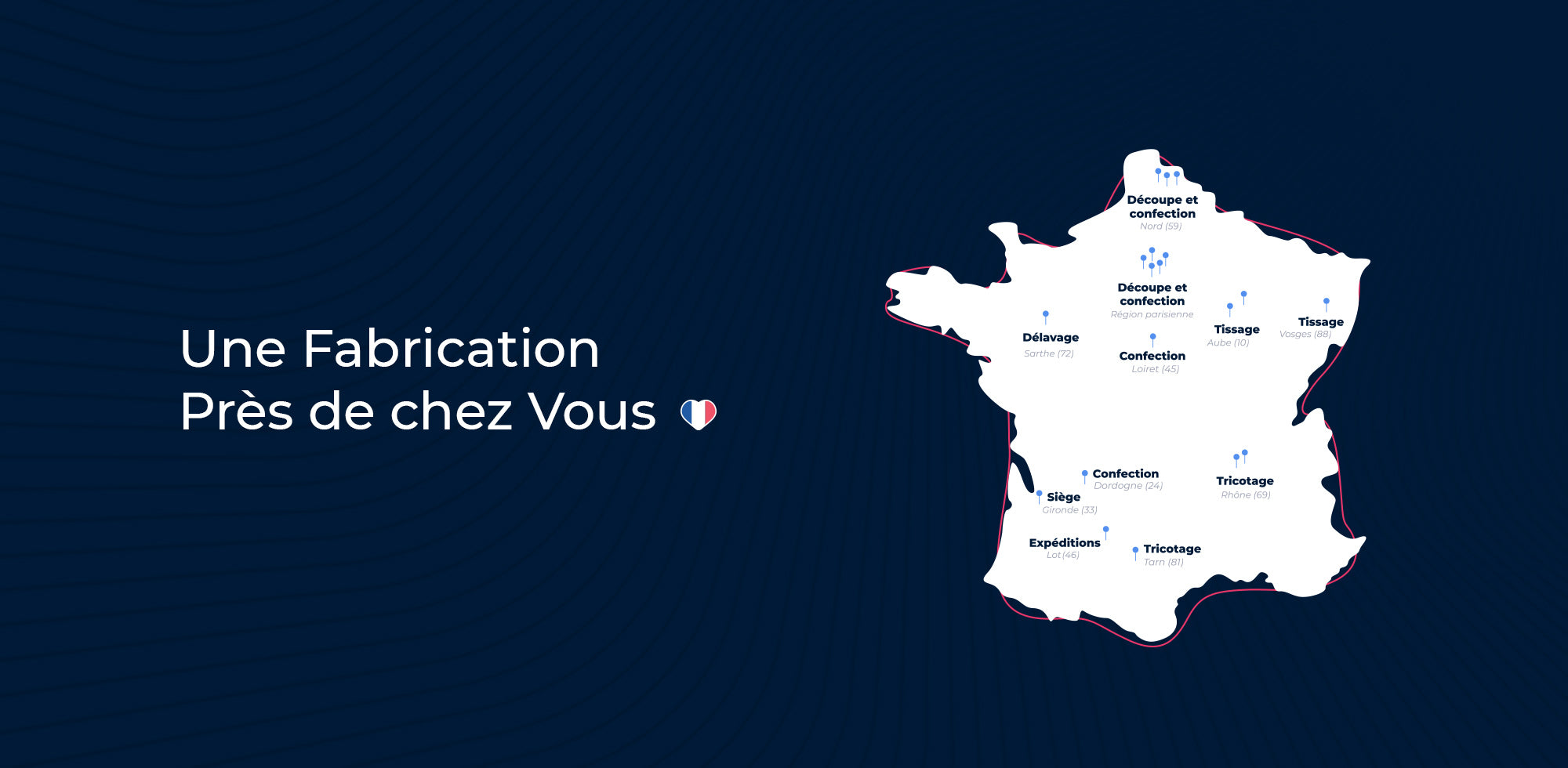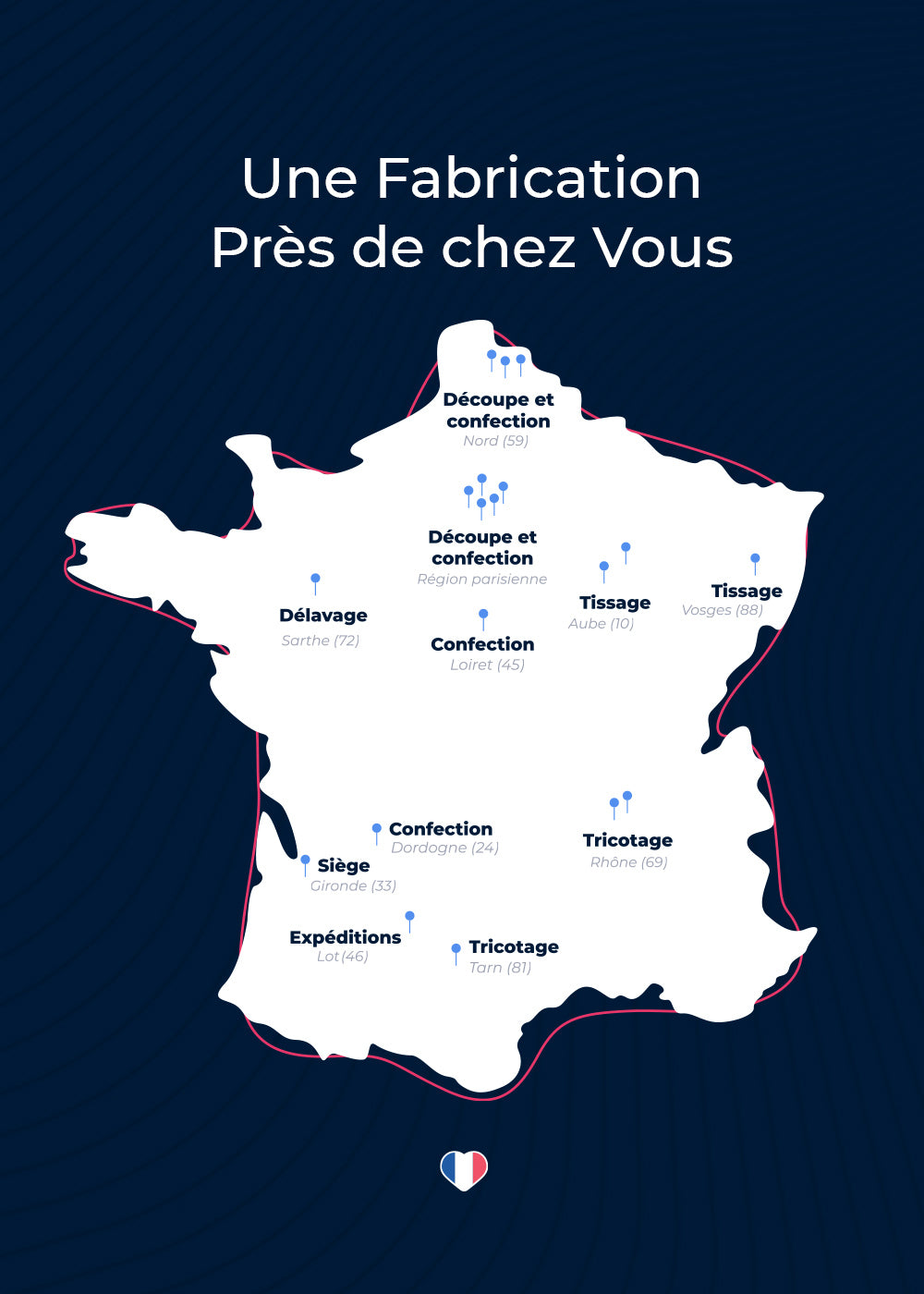 Du tricotage à la confection, en passant par les accessoires et jusqu’au marquage, l’ensemble de nos étapes de fabrication sont réalisées sur le territoire par l’un de nos 36 ateliers partenaires !